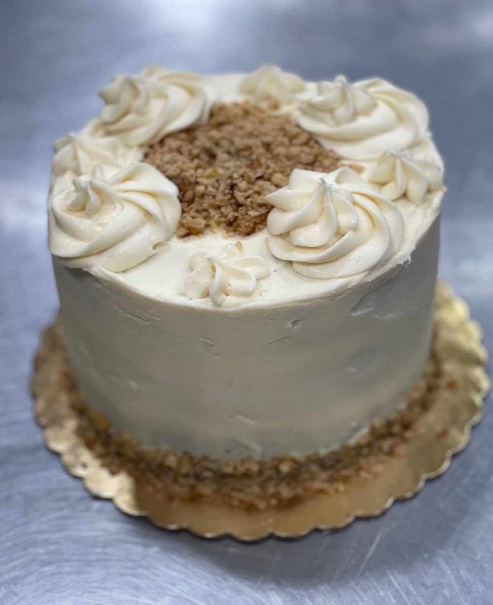 This moist 3-layer vanilla cake is loaded with carrots and walnuts incredible spices that will have you wanting more than just one slice. It is adorned with our creamy and delicious cream cheese icing. You won't be disappointed.